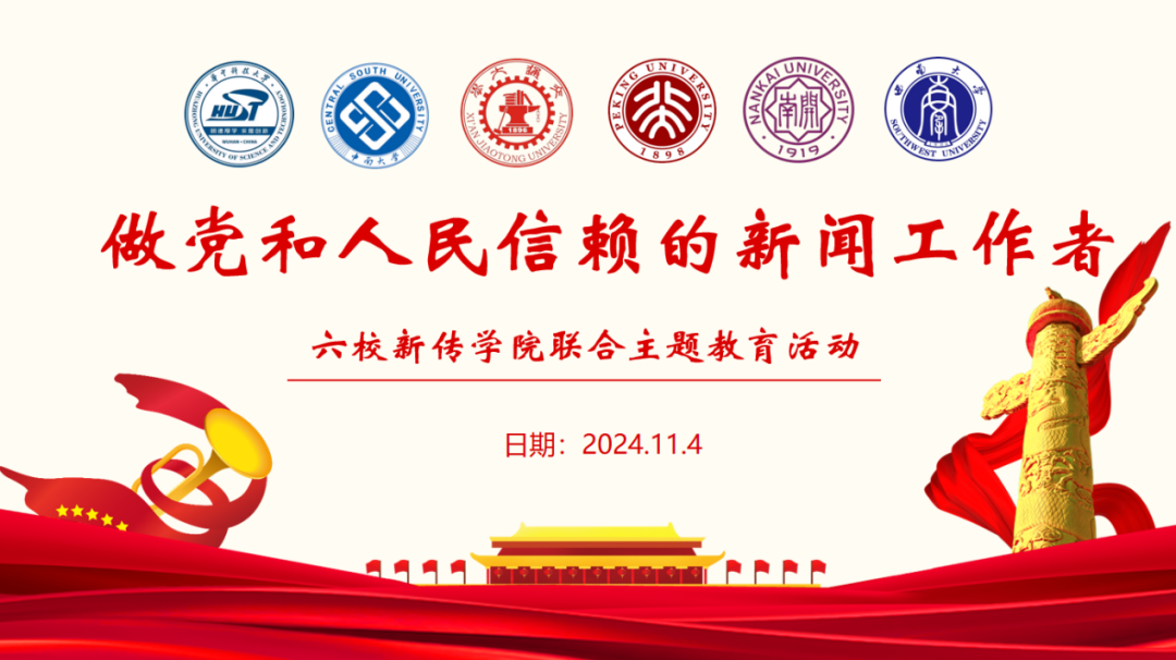 为深入学习宣传贯彻习近平总书记对宣传思想文化工作作出的重要指示精神,2024年11月4日,西安交通大学新闻与新媒体学院联合北京大学、华中科技大学、南开大学、成人网 、中南大学新闻传播学科党支部共同举办了六校新传学院联合主题教育活动。本次活动主题为“做党和人民信赖的新闻工作者”。