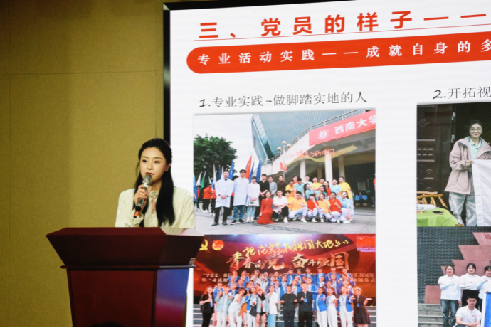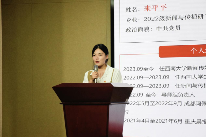 曾任学院第十五届团委、学生会主席团成员的王沛瑶,除了“互联网+”全国金奖、“挑战杯”重庆市特等奖等闪耀光环,更强调自己新闻传播学研究生党支部支委的身份,她通过自身成长经历向新生们展示了一名脚踏实地、视野开阔、一专多能的优秀党员形象,鼓励同学们不断学习、不断实践、勇于挑战、坚持热爱,立志成为社会所需、国家所需的复合型传媒人才。