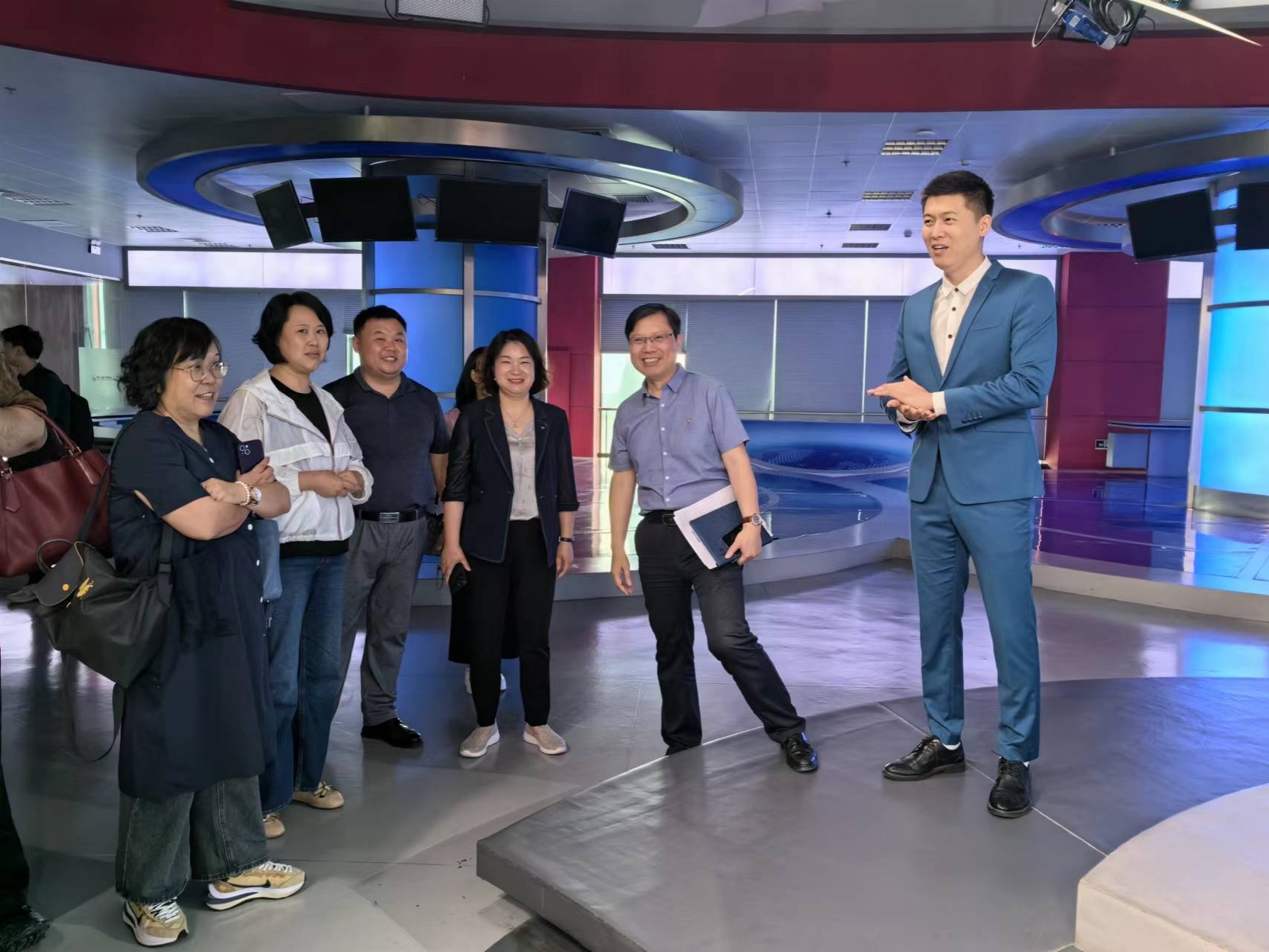 在安徽广播电视台成人网,学院一行参观了新闻1号演播厅、非编机房与《每日新闻报》演播厅。座谈中,成人网主任鄢法孺对中心业务进行了详尽介绍,并阐释了在面对行业变局中该单位如何变革新闻制作的模式。张秋丽副教授与《每日新闻报》主持人孙鹏飞在播音人才培养等方面进行了详细探讨与交流。双方还在县级融媒体中心建设、舆情研究、实习岗位与校企合作等方面进行了深入的沟通。最后,学院领导看望了在安徽广播电视台工作的校友宛月琴、吴言。