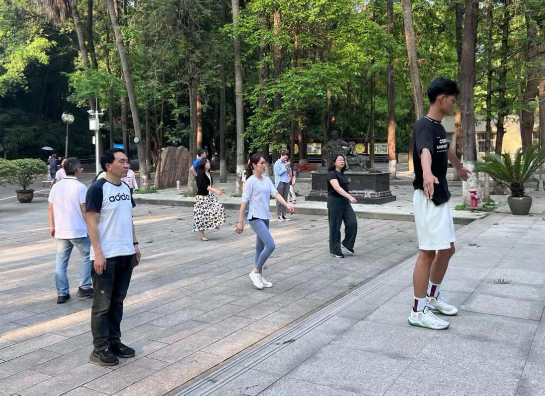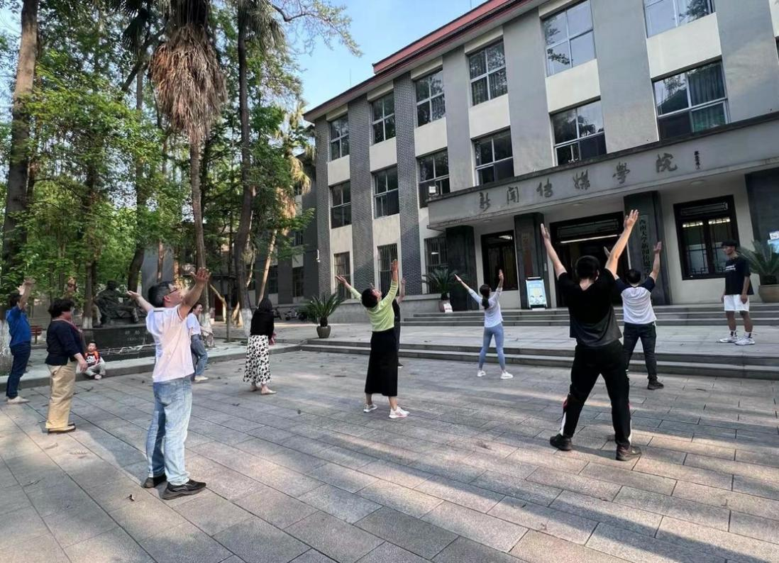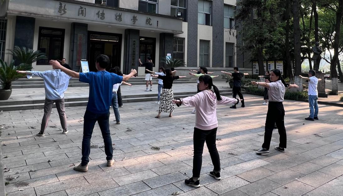 在领操人员的带领下,学院党委书记李增银、副书记叶海燕等老师们舒展四肢、拉伸筋骨,认真地做热身运动。随后,老师们认真观看领操员的分解教学,反复打磨细节,将每一个小节的动作做到位。随着广播体操的音乐声响起,老师们开始原地踏步走,节奏统一,步伐整齐。他们认真学习,全身心投入,挥洒汗水的身影成为了西大校园中一道靓丽的风景线。
